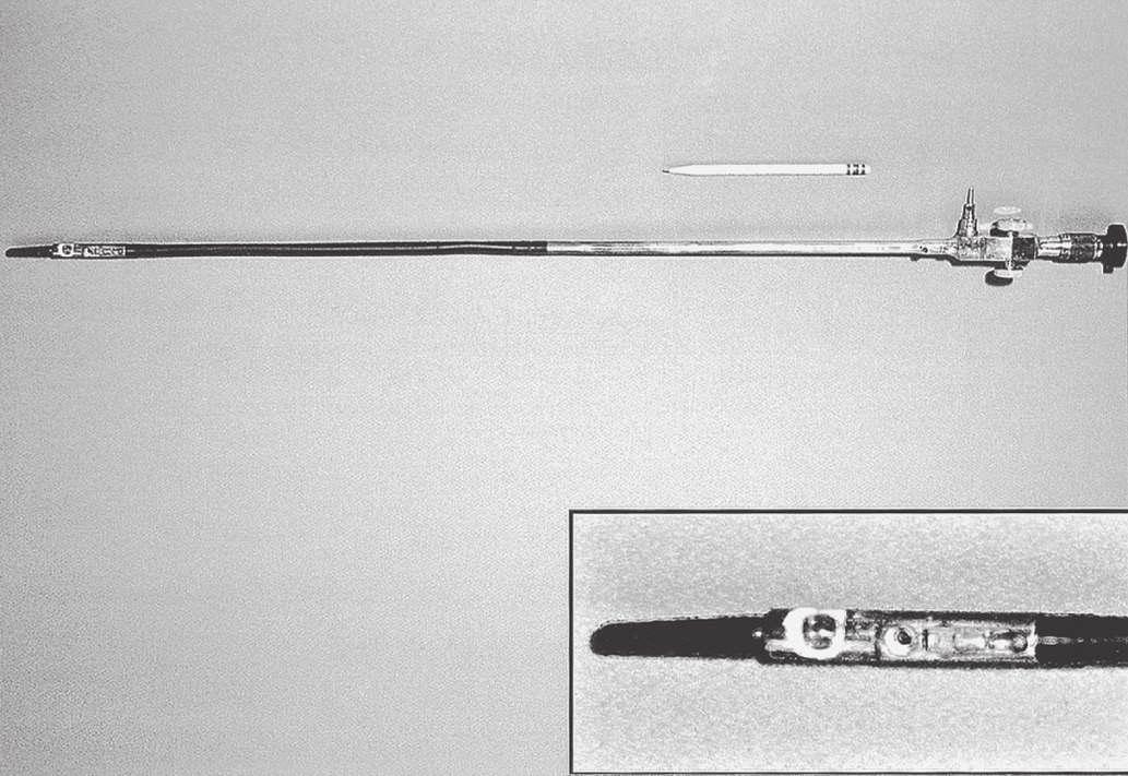 It was not until after 1900 that persistent efforts to develop a usable gastroscope were successful. All attempts to build a flexible instrument using a multiplicity of lenses were designed to be straightened after introduction and were fragile, easily damaged, and cumbersome. Straight tubes with simpler optics were useful, but perforations were still a problem.1 In 1911, Elsner introduced a rigid gastroscope with an outer tube through which a separate inner optical tube with a flexible rubber tip and sideviewing portal could be passed (Fig. 1.5). The rubber tip, previously used in the esophagoscope obturator, was more crucial than it might appear, for it seemed to be, along with the later