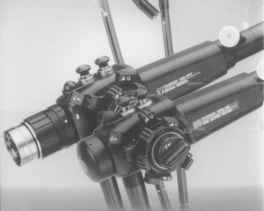 FIG 1.12 Fujinon fiberoptic panendoscope (top) and its successor, the Videopanendoscope (bottom), 1990, showing the two kinds of operating heads. (From advertisement in Gastrointest Endosc 36:240–241, 1990.) A