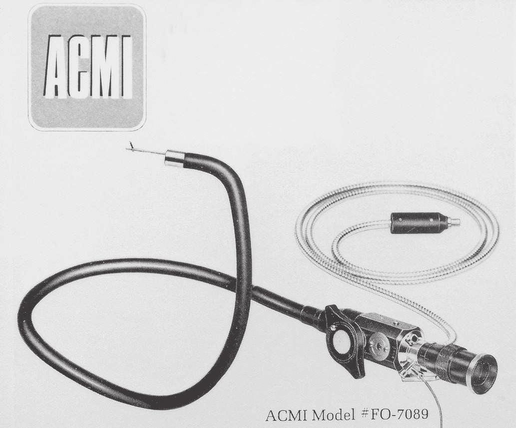 Gastroduodenal Fiberscope. This was a very flexible side-viewing instrument with an electric light on its distal end, an air channel, and an adjustable focusing lens proximally. The tip lacked what was by then the “obligatory” rubber finger, and this omission was a source of criticism; one was added on a later model. Although some individuals criticized the quality of the image, most believed the size and brightness were superior to the semiflexible scopes. This model, the ACMI 4990, was introduced to the market late in 1960 after being tested by Hirschowitz on himself and numerous patients. In 1961, the senior author of this chapter was in a gastroenterology fellowship at the Emory University Clinic with Schroder. He vividly recalls Schroder’s reaction after the first use of the new fiberscope around March 1962 (Fig. 1.9). Upon finishing the initial examination using the new device, he turned to him and said, “Anybody want to buy a used Benedict operating scope?” The senior author does not recall it ever being used again, as the Hirschowitz Gastroduodenal Fiberscope was clearly superior in his view, and he finished his training with that instrument.