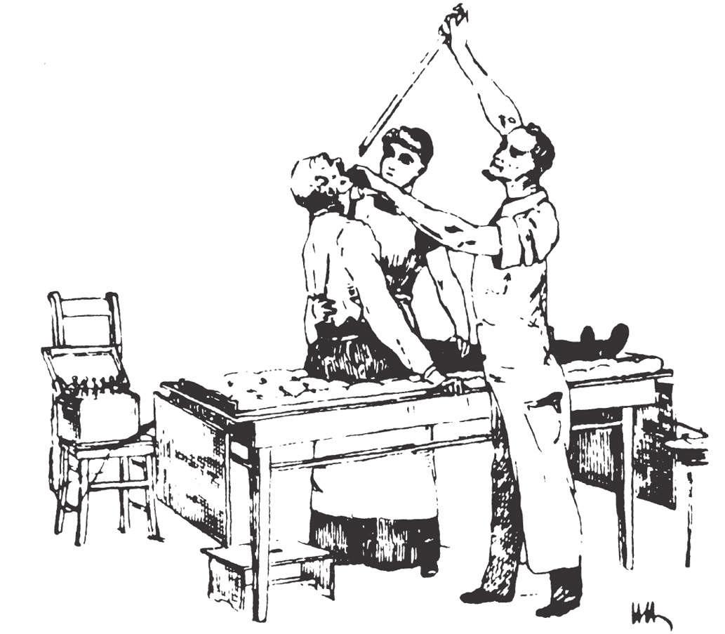 FIG 1.6 Wolf-Schindler “flexible” gastroscope (top) being used by Schindler (bottom) with his wife as the head holder. (From Edmonson JM: History of