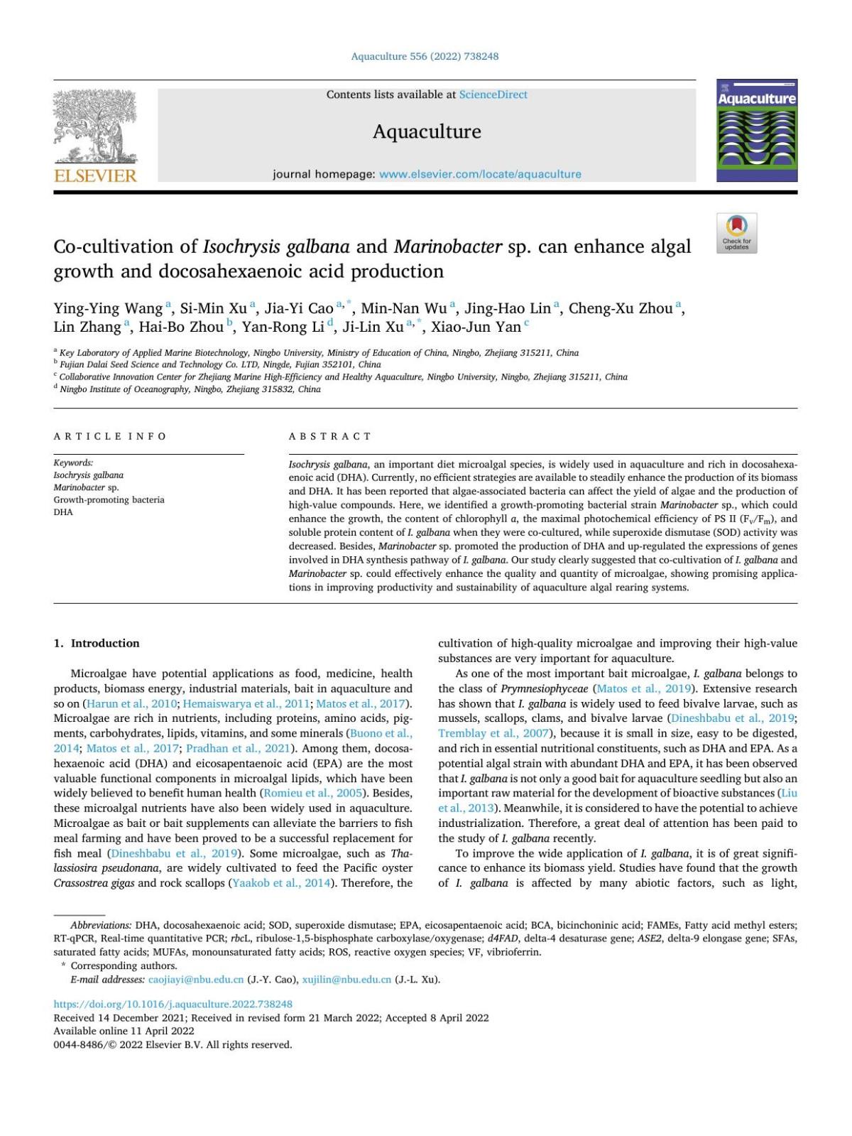 I. galbana 3011 was obtained from the Marine Biotechnology Laboratory of Ningbo University, China. As a culture medium, the seawater was filtered through 0.22-μm cellulose acetate membranes and then sterilized by autoclaving. NMB3 medium used in this study was composed of KNO3 (100 mg/L), KH2PO4 (10 mg/L), MnSO4 H2O (2.5 mg/L), FeSO4 7H2O (2.5 mg/L), EDTA-Na2 (10 mg/L), vitamin B1 (6 μg/ L), and vitamin B12 (0.05 μg/L) (Yang et al., 2016). A photoperiod of 12/ 12-h day/night was applied with a light intensity of 100 μmol photon m 2 s 1 using a cool light fluorescent lamp. The temperature was controlled at 25 ◦ C throughout the experiment. Marinobacter sp. used in this study was isolated from I. galbana culture and preserved in the Marine Biotechnology Laboratory of Ningbo University. Marinobacter sp. was freshly cultured on a 2216E marine medium at 28 ◦ C before experiments.