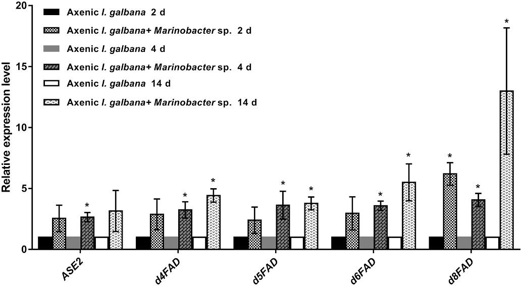 For fatty acid analysis, the samples from mono-culture of I. galbana, mono-culture of Marinobacter sp., and their co-cultures were collected on the 14th day post-co-culturing by centrifuging at 10,000 rpm for 10 min. The obtained I. galbana and Marinobancter sp. pellets were prefrozen in liquid nitrogen and dried by the vacuum freeze-drying system for further analysis.
