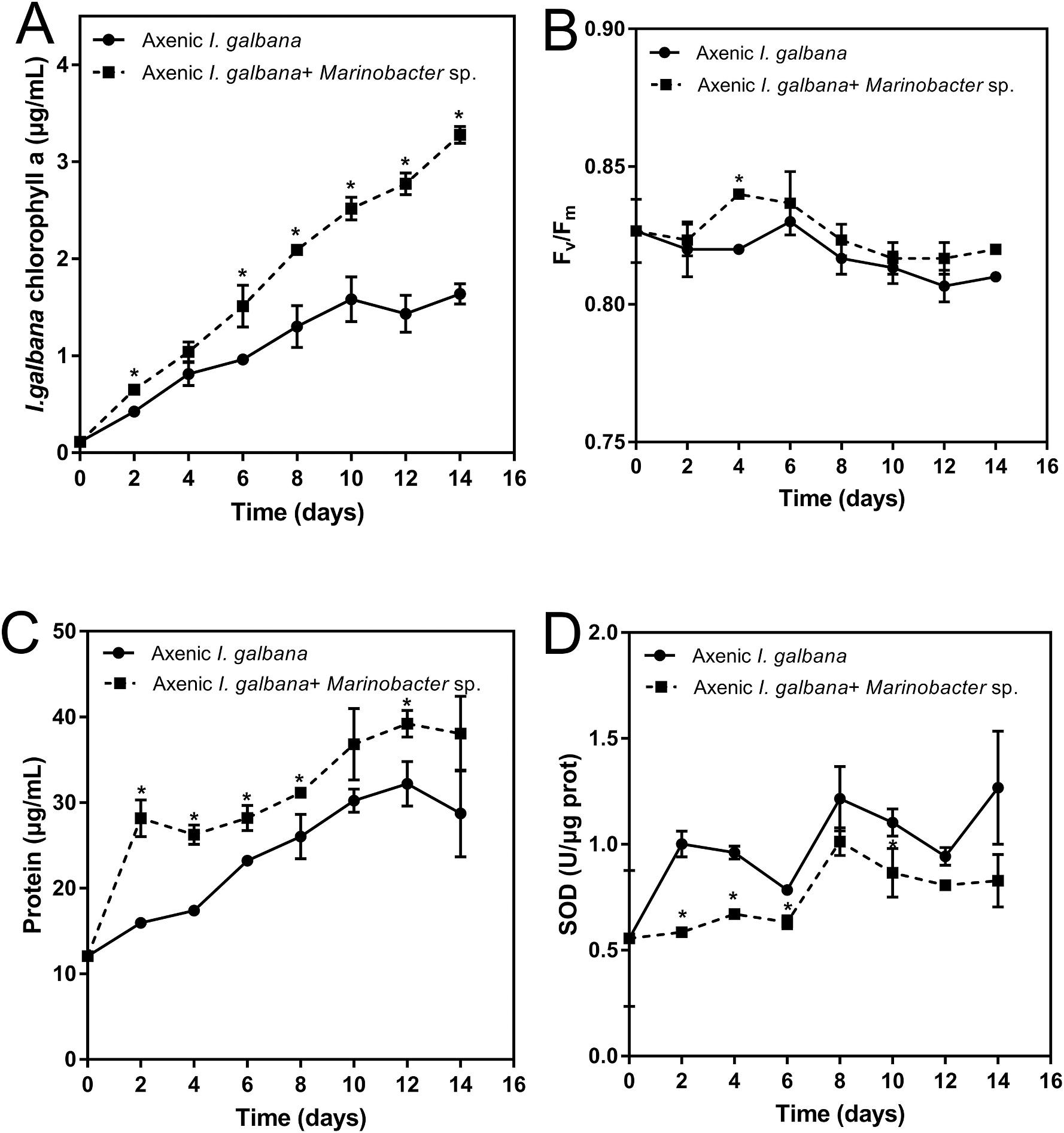 To study the physiological and biochemical effects of Marinobacter sp. on I. galbana, the content of chlorophyll a, Fv/F, soluble protein content, and SOD activity of I. galbana in the co-culture and monoculture systems were compared (Fig. 2). During 14 days of monitoring, the content of algal chlorophyll a in co-cultures was significantly higher compared with the I. galbana mono-culture (Fig. 2A). The chlorophyll fluorescence parameter, Fv/Fm, was used to monitor the effect of Marinobacter sp. on the photosynthetic property of I. galbana. Fig. 2B