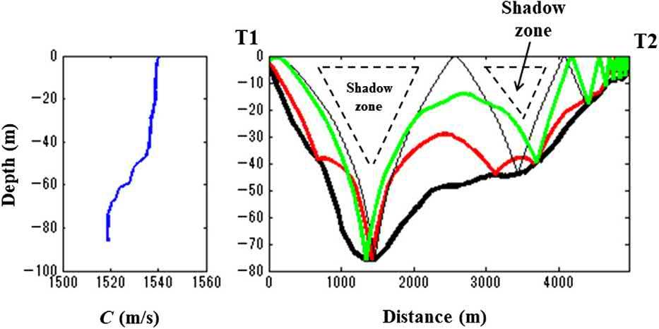 Exampleoftherange-independentraysimulationusingasound-speedprofile,obtainedinahomogenizedsea lyingbetweenacousticstationsT1andT2atdepth5m.Shadowzonesareconstructedattwoplacesnearthe seafloor(Adityawarmanetal.,2012b).
