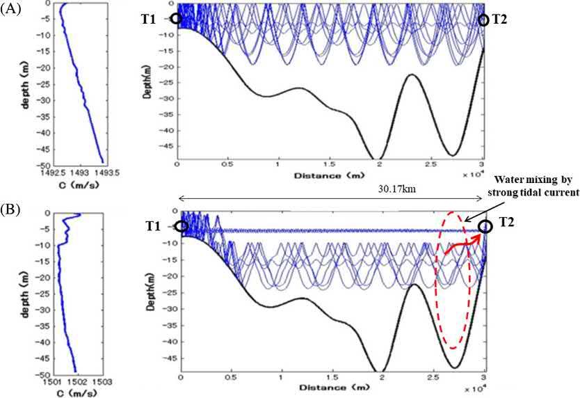 Inmidlatitudecoastalseas,thermalstratificationinsummerisreplacedbyhomogenizedwater inwinterduetosurfacecoolingcombinedwithstrengthenedsurfacewindstresses.Forthecoastal seaswithsuchenvironments,specificconsiderationisneededtomaintainthesuccessreceivingrate oftransmissionsoundatasatisfactorypercentage.Torealizeitanappropriatedepthofacoustic transceiverisatamiddlebetweenthesurfaceandseaflooriftransducerdepthsarefixedduringthe sound-transmissionexperiment.AnothermethodtoincreasethesuccessrateistoexecuteCTDsurveysforconfirmingthepresentsound-speedprofileatthetransitionoftheseasonandthetransceiverdepthsareadjustedtomatchtheupdatedsound-speedprofile.Anoptimumreceivingrateof soundtransmissionisusuallyattainedbetweentheacousticstations,locatedatthesamedepthfrom theseasurfaceabovetherelativelyflatseafloor.