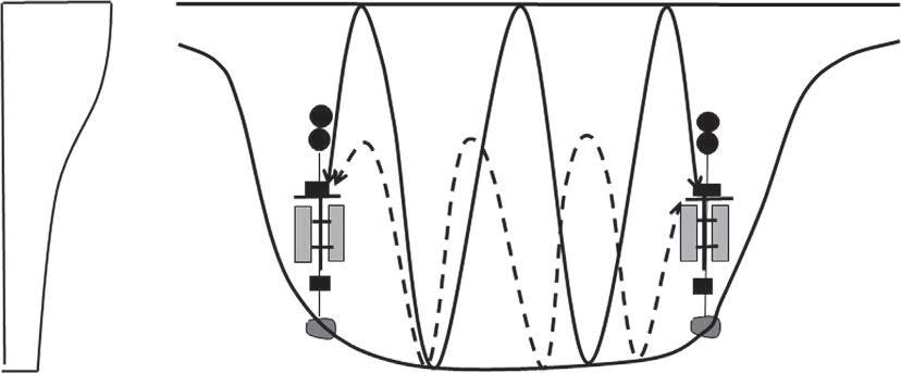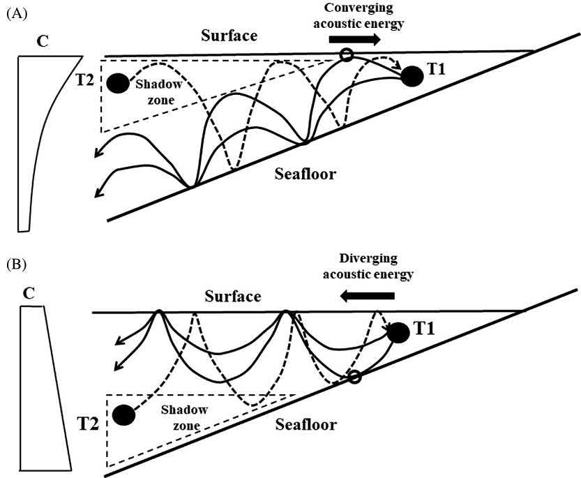 Specificshadowzonesareconstructedwhenreciprocalsoundtransmissionisperformedona slopingseafloorinnearshorebeachesandshelfseas.Inastratifiedseaashadowzoneisconstructedbelowthesurfacewithincreasingdepthtowardtheoffshore(Fig.1.11A).Raysreleased fromtheonshorestationT1aresubmergedfromthesurfaceaftertheyhitit.Ontheotherhanda shadowzoneinahomogenizedseaisconstructedalongtheseafloor,deepeningtowardtheoffshore (Fig.1.11B).RaysreleasedfromT1areconfinedtotheupperlayeraftertheyhittheseafloor.No transmissionsoundisreceivedattheoffshorestationT2whenitislocatedinsidetheshadowzone. AcousticenergyisconvergedtowardonshorestationT1forboththestratifiedandhomogenized seas.ThustheconvergingsoundissuccessfullyreceivedatT1,evenifitisplacedatanydepths.