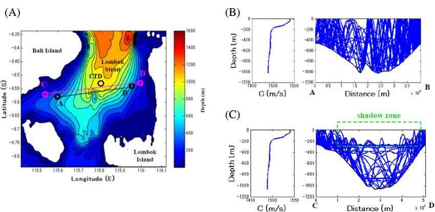 OneexampleofshadowzonesisobtainedintheLombokStraitbetweenBaliandLombok IslandsinIndonesia,wheresignificantpartoftheIndonesianThroughflow(ITF)passesthrough (Fig.1.9A)(GordonandFine,1996).Range-independentraysimulationisperformedbetweenstationsAandBandstationsCandDusingoneCTDdataobtainedatthecentralpartofthestrait. Whenacousticsourceandreceiverarelocatedat5mabovetheseafloorwithdepth450m,no shadowzonesareconstructedinthenear-surfacelayerofthecentralpartwithamaximumfloor depthofabout1000m(Fig.1.9B).However,forthesource receiversystemlocatedat5mabove theseafloorwithdepth250m,awideshadowzoneisconstructedintheupper250mofthecentral region(Fig.1.9C).Asaresult,thesiteswithfloordepth450mareselectedasappropriateCAT stationstomonitortheITFtransportbecausethemajorstreamoftheITFisconfinedtotheupper 200maroundthepermanentthermocline.