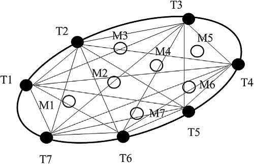 SketchoftheOATarraycomposedofsevenacousticstations.T1 T7aretheacousticstationsandthestraight linesconnectingthestationsarethesound-transmissionlinesprojectedtoahorizontalslice.Circlesarethe positionsofconventionalcurrent-metermooring(M1 M7)withthesamenumberastheOATarray. OAT,Ocean acoustictomography.