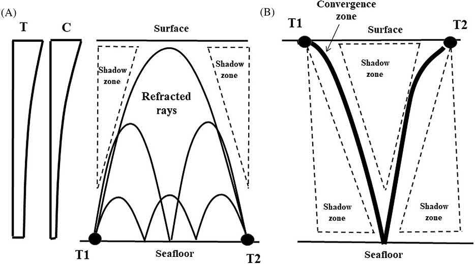 Idealizedsoundpropagationinastratifiedsea:(A)raypatternbetweenacousticsource(T1)andreceiver(T2), locatedneartheseafloor,and(B)raypatternbetweenT1andT2,locatedneartheseasurface.