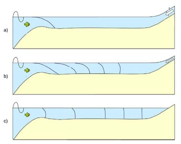 FIG.1.1.4 Salinityprofilesinanestuarywheresalinityisjointlydeterminedbyriverdischargeandtide.(a)Salinewedgeatthe mouthortheestuaryisfulloffreshwaterinfloodseasons;seawaterpartiallypollutesthefreshwaterorbrackishwaterappearsin theestuarywhendischargeismedium(b);theestuaryisfullymixedwithseawaterindryseasons(c). (ReproducedwithpermissionfromSavenije,H.H.G.,2012.SalinityandTidesinAlluvialEstuaries.DelftUniversityofTechnologyWaterResources, SectionP.O.Box50482600GA,Delft,TheNetherlands.)