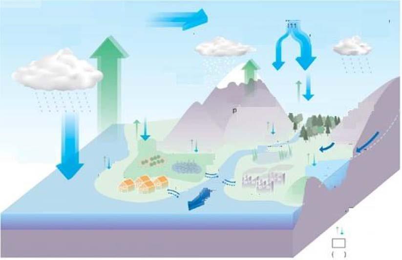 Wateristransportedfromoneplacetoanother,fromoceantoair,andfromrivertoocean,through complexphysical/chemicalprocesseslikeevaporation,condensation,precipitation,infiltration,runoff,