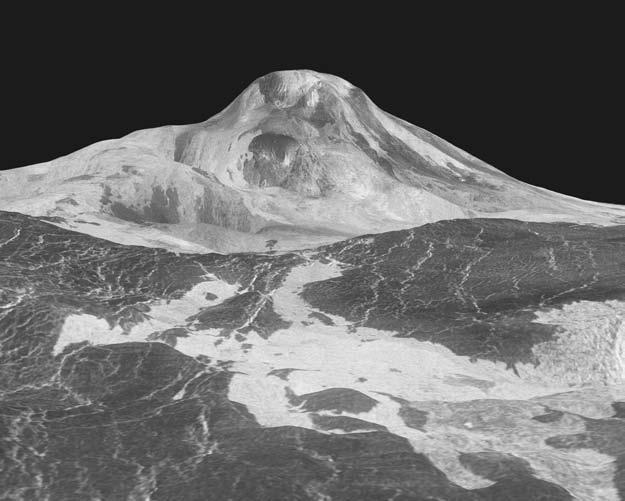 Figure 2. Maat Mons, Venus. The flank of Venus’s highest volcano is draped with overlapping lava flows extending across the surrounding plains for hundreds of kilometers. Terrain elevation reconstructed using radar data from the NASA Magellan mission.