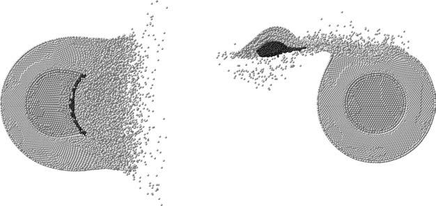 Figure 1. Simulations showing the effect of large collisions on Earth. The illustrations show in cross-section the impact of a 4000-km wide planetesimal striking the Earth with a velocity of 19 km/s. The ensuing disruption strongly depends on the impact direction, whether a head-on collision (left), or a grazing collision (right; 60º from the normal at the impact point). The numerical code uses spherical particles to simulate shock and disruption of the Earth and the projectile. The dark gray particles indicate the strongly deformed metallic core of a projectile. The inner darker-gray circle within the Earth represents its metallic core.