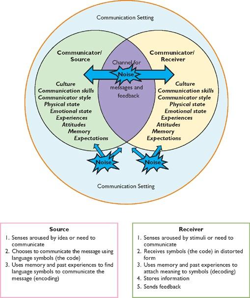 Figure 1.1 illustrates how the components of the communication process work. The circles representing the source (the originator of the message) and the receiver (the recipient of the message) overlap as each person sends messages (communication) and feedback (response to a message) to the other through a frame of reference (a perceptual screen) communication noise (the potential for communication disruption). The overlapping circles suggest that communication is possible only when each communicator understands the other’s message. The variables that affect the frame of reference make up the perceptual screen through which verbal and nonverbal messages are communicated.