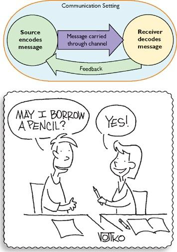 In any communication process, the degree to which the communication is effective depends on the communicators’ mutual understanding of the signals being used. Suppose you are about to take an examination and suddenly realize you forgot to bring a pencil to class. You ask one of your friends, “May I please borrow a pencil?” She says, “Yes” and gives you a pencil. You have just participated in an effective communication transaction. You (communicator A) encoded a message (“May I please borrow a pencil?”) and sent it out over a channel (vocal tones carried on sound waves) to your friend (communicator B). Your friend received the message (by using sensory agents, ears) and decoded it (understood that you wanted a pencil). Your friend’s feedback (the word yes and handing the pencil to you) indicated that the message was successfully received and decoded. (This is illustrated in Figure 1.2.)