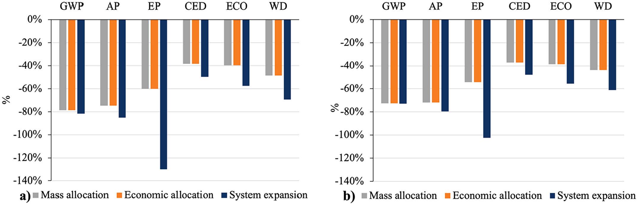 Fig. 4. Percentage reduction in the environmental impact of the tested low-density (a) and high-density (b) aquaponic systems when changing the electricity source from the Italian grid mix (current system) to a photovoltaic plant. GWP: Global warming potential; AP: Acidification potential; EP: Eutrophication potential; CED: Cumulative energy demand; ECO: Freshwater ecotoxicity; WD: Water depletion. Data were analysed considering mass allocation (whole impact allocated on the basis of the mass – kilograms - of fish and lettuce produced during the experiment), economic allocation (whole impact allocated on the basis of the relative economic value of the fish and lettuce leaves produced), and system expansion (expanded the system to include the production of lettuce through a traditional system and subtracting this impact to the whole impact associated to the aquaponic system).