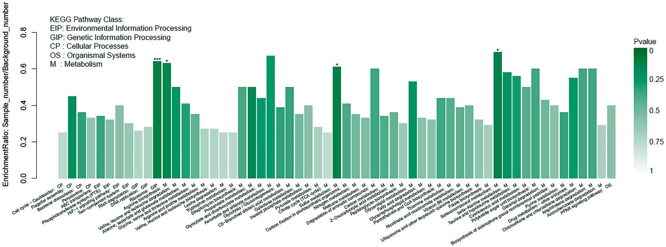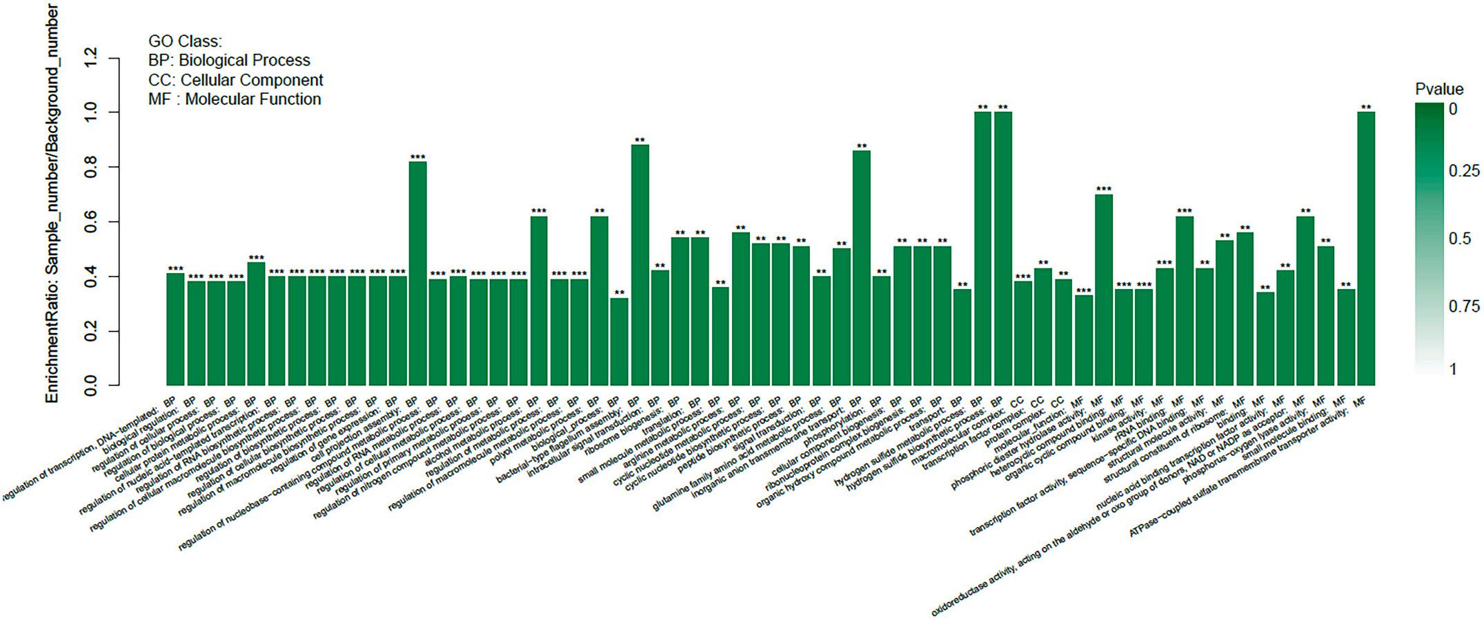 In order to ensure the accuracy of subsequent bioinformatics analysis, the original sequencing data is first filtered to obtain high quality sequencing data (clean data). High quality sequences were aligned to the specified reference genome by Bowtie software. The differentially expressed genes were screened under the condition of P ≤ 0.05, |logFC| ≥ 1, which means that P ≤ 0.05 after correction, and the difference multiples more than 2 times were identified as significant differences. Significant enrichment analysis of GO functions was performed on differential genes to illustrate the functional enrichment of differential genes using the Blast2GO software, and the differences between samples were clarified at the level of gene function. KOBAS software was used to perform KEGG pathway enrichment analysis.