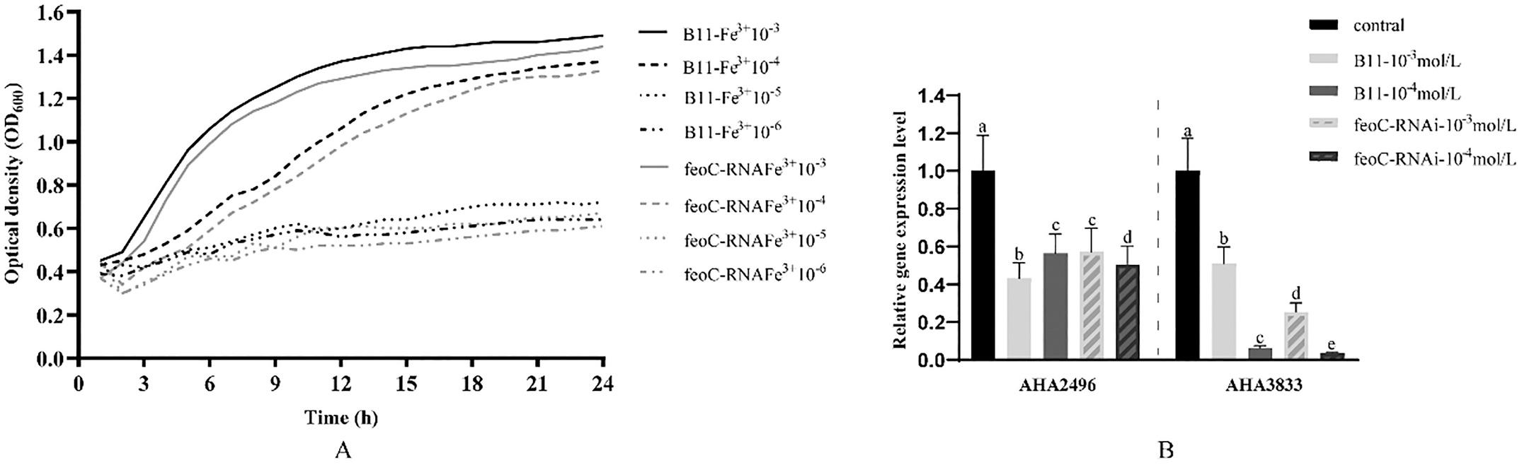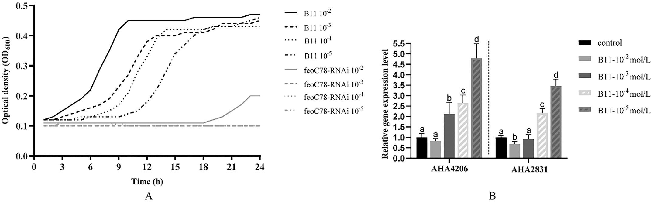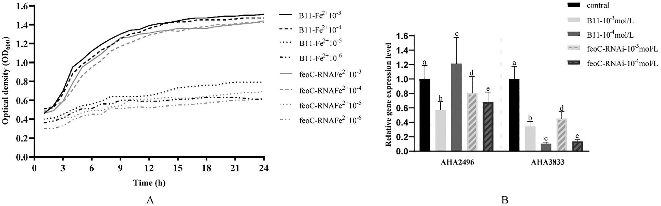 2.8. Effect of iron and magnesium on the growth and related genes expression of B11 and feoC-RNAi