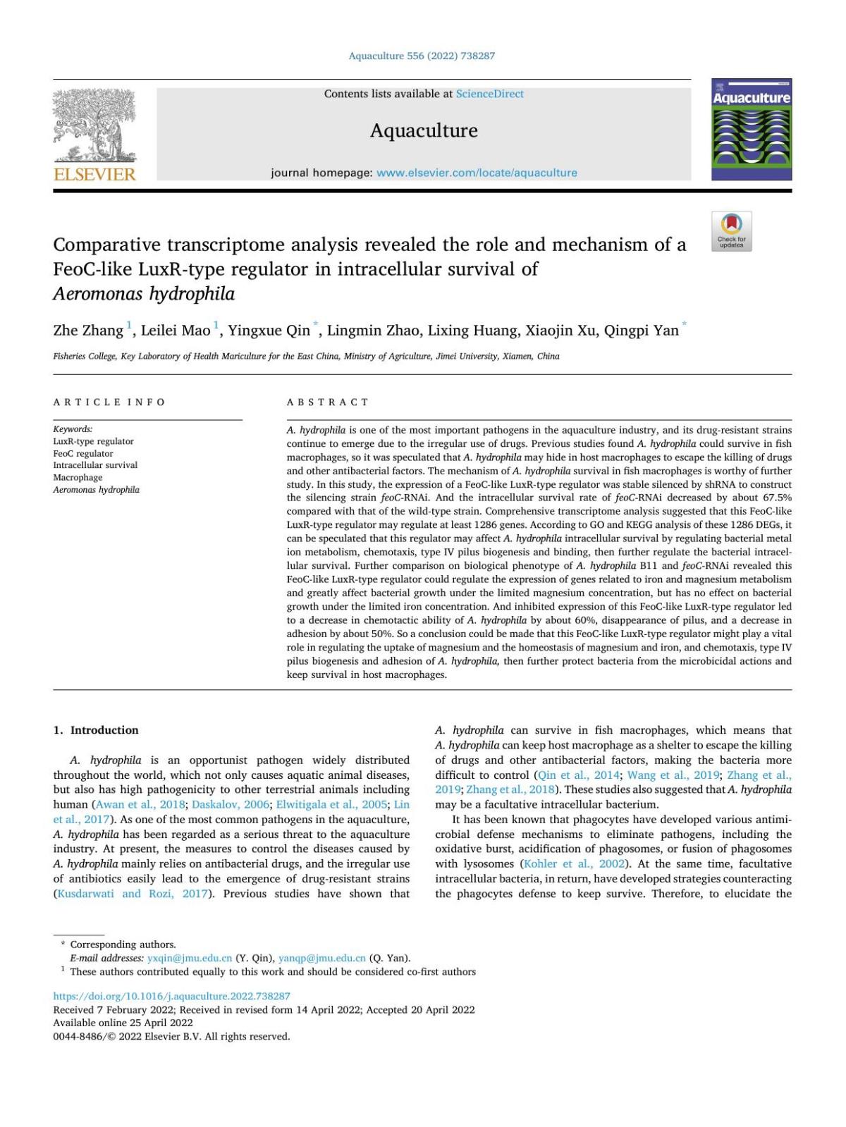 The genome analysis of the pathogenic A. hydrophila B11 isolated from diseased eel revealed that six LuxR family proteins were found in this bacterium (Mao et al., 2020). Among them, LuxR05735 is the smallest one with only 243 bp, but it had the greatest impact on the intracellular survival of A. hydrophila B11 (Accession Number: MN327964) (Mao, 2019). Furthermore, LuxR05735 is also annotated as FeoC-like transcription regulator in databases. It means that LuxR05735 has both the structure and function of LuxR-type family and FeoC transcriptional regulatory factors. FeoC is regarded as a member of Feo system which is the first transport system commonly used by bacteria to acquire environment Fe2+ under anaerobic and low pH conditions, but the function of FeoC is still controversial (Hung et al., 2012; Lau et al., 2016). LuxR family proteins have been known to distribute in a variety of bacteria, which can regulate various physiological functions of bacteria (Zeng and Xie, 2011). Studies have also suggested that LuxR family proteins involve in the adaptation of bacteria to the host environment, and have a regulatory effect on the intracellular viability of bacteria (Ahmer, 2004; Fang et al., 2013). At the same time, the host cells also evolve several mechanisms to limit the survival and growth of bacteria in them, including generating reactive oxygen and nitrogen species, lowering the pH of the compartment harboring and invading microbe, limiting pathogenic microbes access to metal ion and so on (Blanc-Potard and Groisman, 2021; Gan et al., 2019; Nunez et al., 2018).As transition metals such as iron, manganese, and zinc play a key role in nutrition for both microbes and their hosts, intracellular bacteria must regulate the uptake and metabolism of metal ion in the intracellular environment and help bacteria resist cell killing, which may be the key factor in determining the survival of intracellular bacteria. What is worthy of further study is how this regulator, which has both the LuxR and FeoC characteristics, regulates the expression of A. hydrophila and further help bacteria survive in host macrophages.