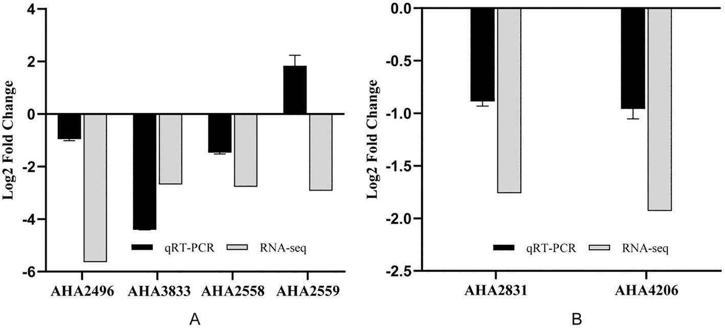 The RNA samples returned by the sequencing company was used for qPCR verification to confirm the transcriptome data. The other RNA samples was extracted from freshly cultured bacteria and first-strand cDNA synthesis were performed using EasyPure RNA Kit (TransGen Biotech, China) and TransScript® ALL-in-one First-Strand cDNA Synthesis SuperMix (TransGen Biotech, China) according to the manufacturer’s recommended protocol, respectively.
