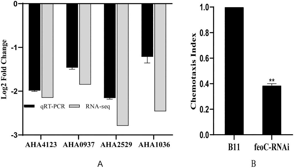 In this study, silencing strain feoC-RNAi was constructed and its intracellular survival ability was evaluated. Then, comparative transcriptome was used to analyze the difference in expression between the wild-type strain and silencing strain. Finally, the biological phenotype was verified to explore the role and mechanism of this FeoC-like LuxRtype regulator in the intracellular survival of A. hydrophila