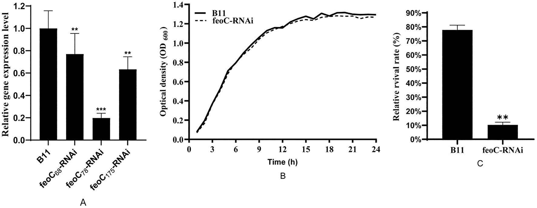 strain exhibited the best efficiency of gene silencing was designated as feoC-RNAi and chosen for further studies.