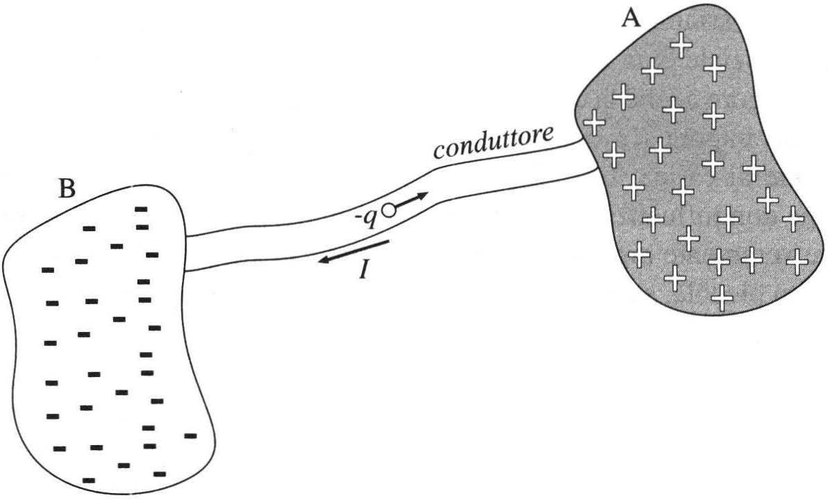 Uno sbilanciamento di cariche, ovvero un accumulo di carichepositive in una regione e negative in un'altra, dà origine a un potenziale non costante, ovvero a un potenziale con un gradiente diverso da zero. Per la (1.3), o nel caso monodimensionale per la (1.7), un gradiente significa una forza applicata alle cariche elettriche. Se unaforzaè applicataa unacarica mobile questa tenderàamuoversi: nel senso opposto al gradiente se si trattadi una carica positiva, nel senso del gradiente se si trattadi una carica negativa. In altre parole, una tensione, ovvero una differenza di potenziale, in presenza di cariche mobili positive o negative, dà origine a una corrente. Perfissare le idee, supponiamo ad esempio che ci sia unosbilanciamentodicarichetradueregioni:Ae B. Alcuni elettronidegli atomi della regioneA sono stati strappati dai rispettivi atomi e spostati nella regione B (adesempio sfregando un vellodi pecoracon una bacchetta d'ambra, o più semplicemente un maglione di lana con una penna di plastica).