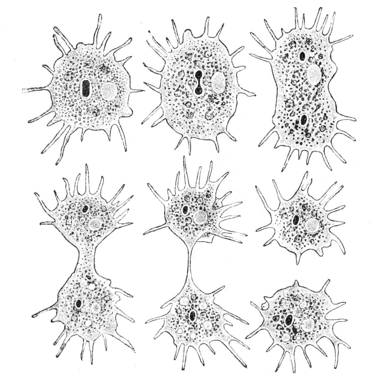 F 4 Amoeba polypodia in successive stages of equal fission; nucleus dark, contractile vacuole clear (From Verworn, after F E Schulze )