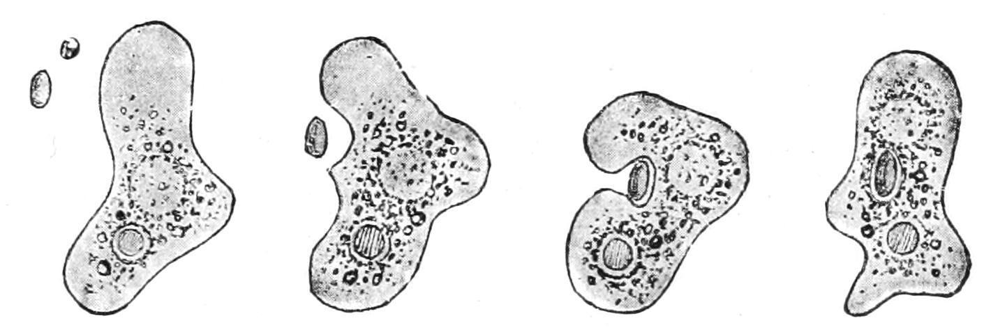 F 3 Amoeba devouring a plant cell; four successive stages of ingestion (From Verworn )
