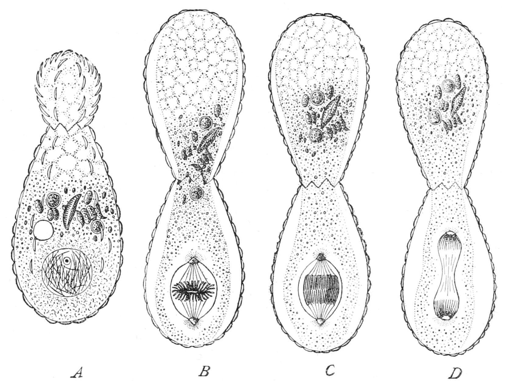 F . 8. Fission with modified karyokinesis in the Filose Rhizopod Euglypha. A, outgrowth of half of the cytoplasm, passage of siliceous plates for young shell outwards; B, completion of shell of second cell, formation of intranuclear spindle; C, D, further stages. (From Wilson, after Schewiakoff.)