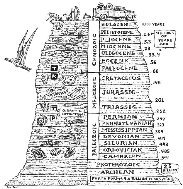 8. Oxygen: Even more important, life itself has made Earth supremely habitable. It’s possible to imagine many other planets with simple microbes, but not so easy to imagine that they evolved the crucial system of photosynthesis that earthly bluegreen bacteria (cyanobacteria) first developed 3.5 billion years ago. Without photosynthesis, there is no free oxygen. (Lots of other planets have oxygen, but it is all bound up into other molecules and is not in the form of free oxygen, or O2). In fact, most solar system planets have an atmosphere of components such as nitrogen and carbon dioxide (the major gases in the atmospheres of Mars and Venus) but no free oxygen. As you will see in chapter 6, for 80 percent of life’s history on Earth, there was not enough free oxygen for even the simplest animals to evolve. It wasn’t until about 2.4 billion years ago that oxygen first began to accumulate in our oceans and atmosphere, and it was not until the Late Cambrian or Ordovician (about 500 million years ago) that free oxygen probably reached the current level of 21 percent. Without free oxygen, the only life possible is