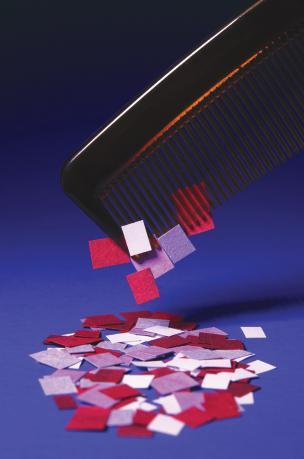 A plastic comb attracts pieces of paper with an electrostatic force.