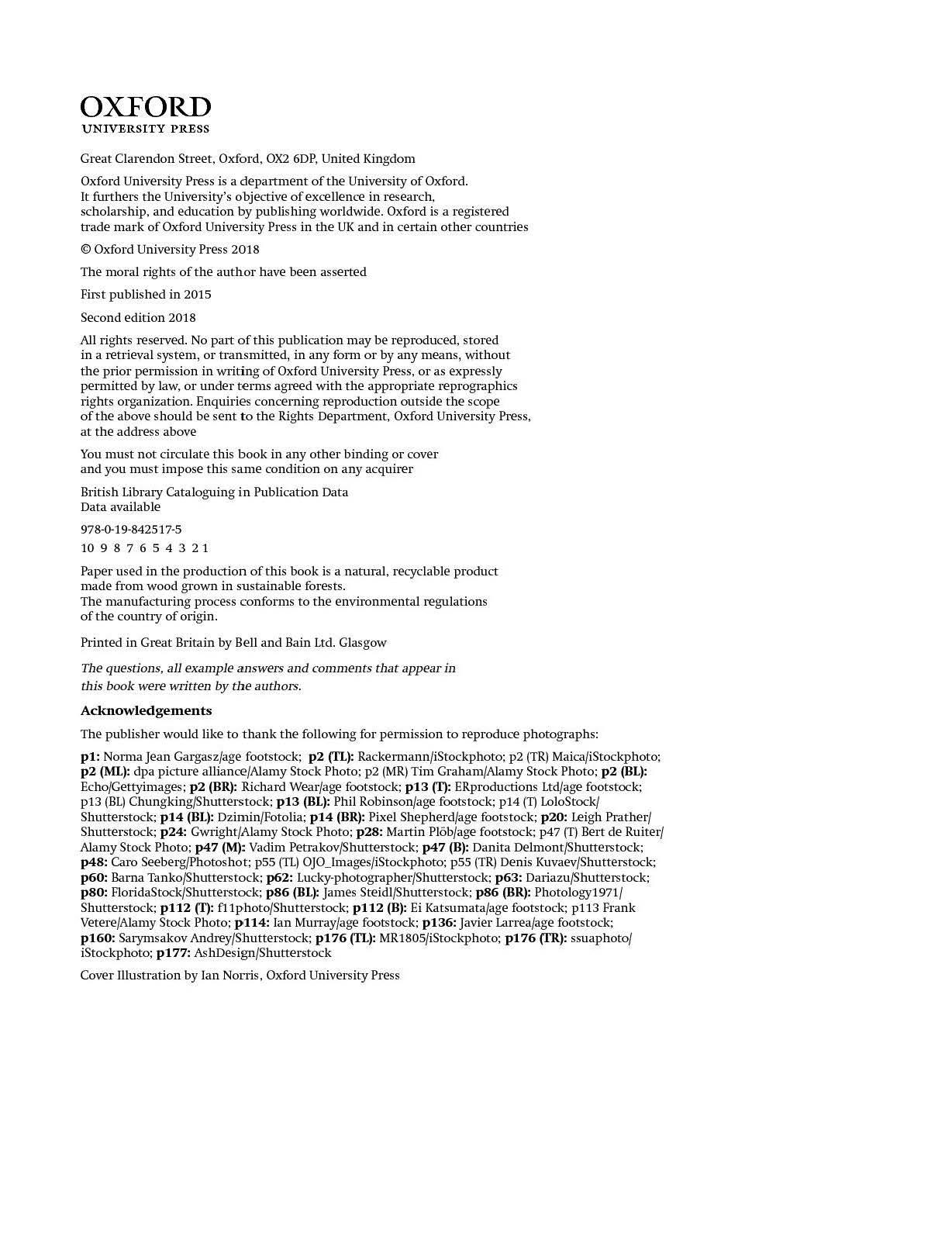 The publisher would like to thank the following for permission to reproduce photographs: pt: Norma Jean Gargasz/age footstock; p2 (fl): Rackem1ann/iStockphoto; p2 (TR) Maica/iStockphoto; p2 (Ml): dpa picture alliance/Alamy Stock Photo; p2 (MR) Tim Graham/Ala.my Stock Photo; p2 (Bl): Echo/Gettyimages; p2 (BR): Richard Wear/age footstock; pt3 ff): ERproductions Ltd/age footstock; p13 (BL) ChungkingJShutterstock; pt3 (Bl): Phil Robinson/age footstock; p14 (T) LoloStock/ Shutterstock; pt4 (Bl): Dzimin/ Fotolia; pt4 (BR): Pixel Shepherd/age footstock; p20: Leigh Prather/ Shutterstock; p24: Gwright/Alamy Stock Photo; p28: Martin Plob/age footstock; p47 (T) Bert de Ruiter/ Alamy Stock Photo; p47 (M): Vadim PetrakovJShutterstock; p47 (B): Danita DelmontJShutterstock; p48: Caro SeebergJPhotoshot; p55 (TL) OJO_Images/iStockphoto; pSS (TR) Denis Kuvaev/Shutterstock; p60: Barna Tanko/Shutterstock; p62: Lucky-photographer/Shutterstock; p63: DariazufShutterstock; pSO: FloridaStock/Shutterstock; p86 (Bl): James SteidlfShutterstock; p86 (BR): Photology1971 / Shutterstock; pt t2 (f): f11photo/Shutterstock; pt t2 (B): Ei Katsumata/age footstock; p113 Frank Vetere/Alan1y Stock Photo; pt t 4: Ian Murray/age footstock; pt 3 6: Javier Larrea/age footstock; pt60: Saryms akov Andrey/Shutterstock; pt 76 (Tl): MR1805/iStockphoto; pt 76 (fR): ssuaphoto/ iStockphoto; pt77: AshDesign/Shutterstock