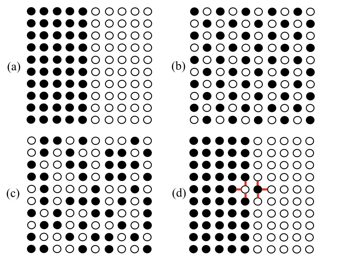 Fig.1.1 Fouratomicconfigurationsofa10 × 10squarecrystallattice,with50‘black’atoms and50‘white’atomsoccupyingthe100latticesites.(a)themostseparatedstate.(b)the mostintermixedstate.(c)oneofthe ≈ 1029 configurationswithsitesoccupiedbyblackand whiteatomsatrandom.(d)theatomicconfigurationshownin(a)withoneexchangebetween blackandwhiteatomsattheinterface.Theexchangeintroduces6newbonds,showninred, betweenblackandwhiteatoms.