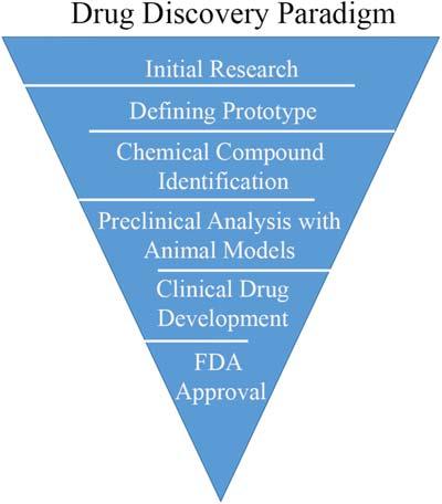 FIGURE1.2 Thegeneralized drugdiscoveryanddevelopment pathwaybeforeanoveldrugpasses throughtheUSFoodandDrug Administration(FDA)approvalfor safetytesting.