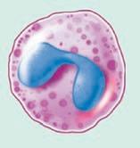 (see Figure 1.5 ■ for the three types of granulocytes (neutrophils, eosinophils, and basophils) as well as monocytes, mast cells, and macrophages, which are shown with a lymphocyte and a red blood cell for relative size comparisons). The three types of granulocytes are named for their characteristic staining pattern when using Wright’s stain. All granulocytes can be recruited from the blood by chemotaxic factors to enter the tissues that stimulate them to move to the site of an infection. Neutrophils are the most abundant type of granulocyte, and they contain neutrally staining granules, that is, their granules do not stain when Wright’s stain is utilized. Fifty to 70% of white blood cells in the blood are neutrophils. The nucleus of a neutrophil is irregular in shape with multiple lobes, which gives the neutrophil the alternative name polymorphonuclear leukocyte with the shortened names of either polys or PMNs. Neutrophils are the first cells that enter the site of an acute infection. They reside only about 12 hours in the circulation or one to two days after migration to the tissue. These cells are in the pus of an infected area, and eventually macrophages come into the infected area as well. Neutrophils are very active in phagocytosis (engulfment and digestion) of foreign cells and particles. They have recently been found to be involved in the presentation of the antigen to T cells, which is one type of cell of the acquired immune system. Antigen