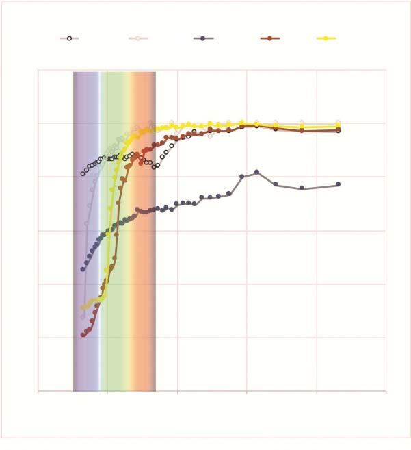 Forexample,ironabsorbsthewavelengthsassociatedwithblueandvioletmuchmorethan copper,butitdoesnotabsorbthewavelengthsassociatedwithred,orange,andyellow.Ithasa fairlyflatabsorptionlineacrossallthewavelengths.1 Stainlesssteelissimilartoiron’sreflectivity, buttheaddedchromiumincreasesthereflectionofportionsofthelightwaveover60%.Stainless steelissaidtoreflect,onaverage,60%ofthelightwave(Figure1.5).