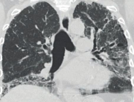Coronal CT shows bibasilar fibrosis and honeycombing (arrows), with relative sparing of the upper lobes. This was a case of idiopathic pulmonary fibrosis.