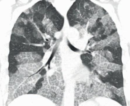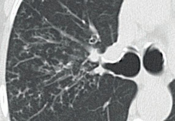 Diffuse cystic bronchiectasis. Bronchiectasis is dilation of the bronchioles. Although cystic fibrosis is the most common cause of bronchiectasis and has an upper-lobe predominance, congenital or post-infectious causes can have a diffuse or lower-lobe distribution.