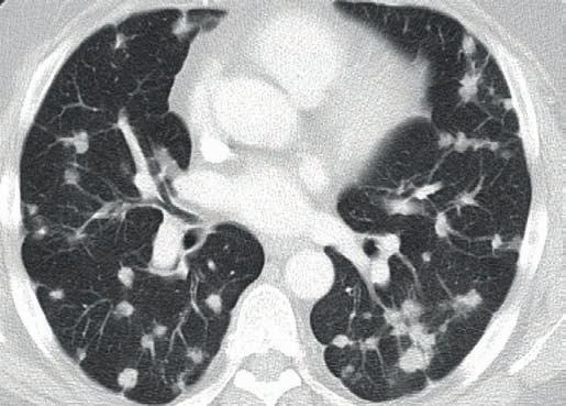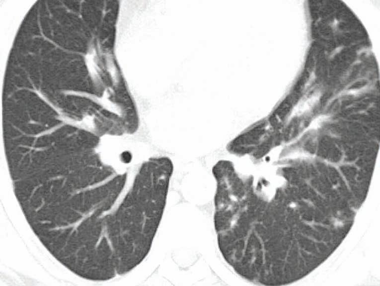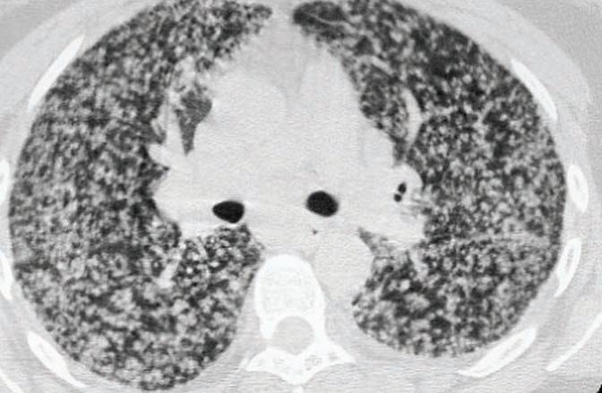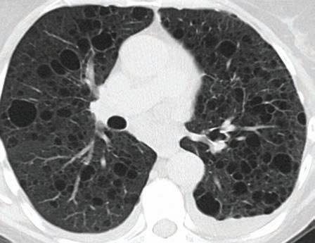 Pulmonary Langerhans cell histiocytosis, which features irregular cysts and nodules predominantly in the upper lungs.
