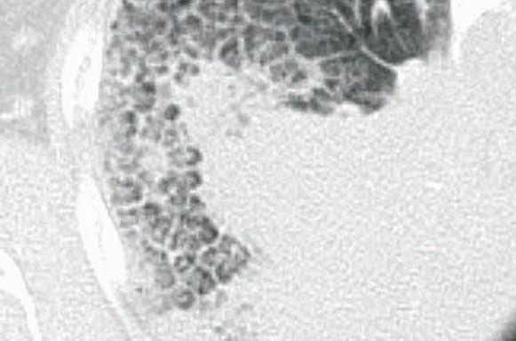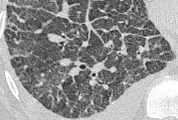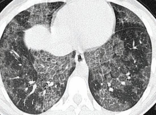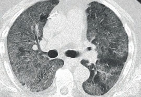 Lymphoid interstitial pneumonia (LIP), an exceptionally rare disease usually associated with Sjögren syndrome and characterized by alveolar distortion from lymphocytic infiltrate and multiple cysts.