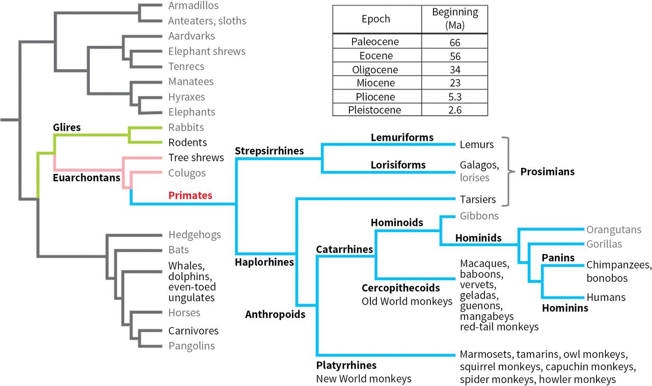 Reference figure. Evolutionary relationships among the mammals mentioned in this book. The table at the top gives onset dates for the geological epochs discussed most frequently in the text. Abbreviation: Ma, million years ago