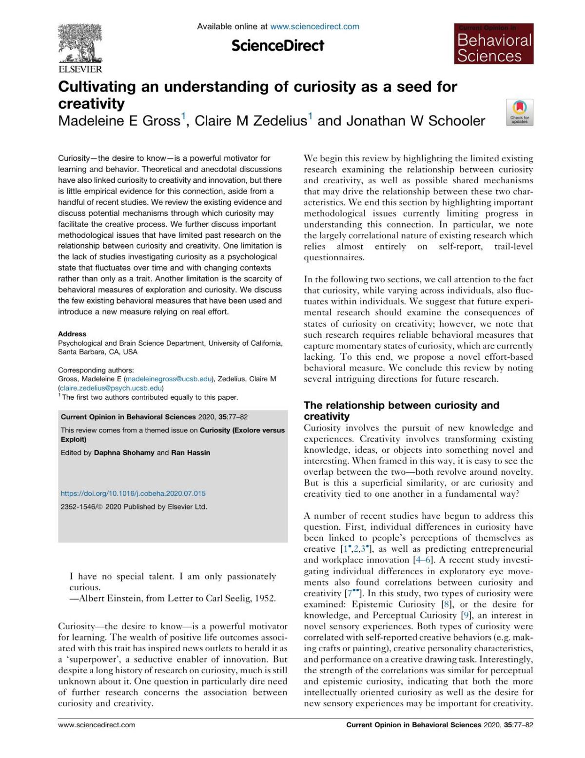 The few studies that have attempted to experimentally induce curiosity, though promising, leave big questions unanswered. For instance, once curiosity is triggered by a cue, a question, or a guess, might it carry over to another topic? Does asking questions or making guesses lead to deep and sustained curiosity? And does the effectiveness of such manipulations depend on moderating factors, such as a person’s expectations, the perceived cost associated with exploring information, or a person’s Openness to Experience, need for closure or need for autonomy [see Refs. 34,31]? And most critical to the present discussion, do manipulations that increase curiosity subsequently impact creativity? Finding the answers to these questions will not only be valuable for our scientific understanding of curiosity, but will be essential for interventions aiming to boost curiosity for the benefit of learning and creativity. Indeed, to the best of our knowledge, despite the highly suggestive relationship between curiosity and creativity, to date, only one published study has specifically demonstrated an experimental link between induced states of curiosity and creativity [15 ].