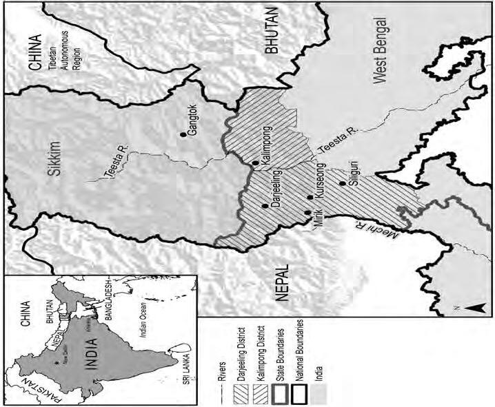 figures in scholarly attention from both Indian and foreign scholars to the eight states that comprised the North-Eastern Council,1 as this does not include West Bengal. Likewise, within Himalayan Studies, Darjeeling has historically been understood as a key node of Nepali-speaking networks, but, with the prominent exception of its literary history,2 has remained largely beyond the scope of researchers focused on Nepal. The same may be said of Tibet and Tibetan Studies: several recent studies of Tibetan history,3 death rituals,4 and trade5 have been based in whole or part on research conducted in Darjeeling, yet the sociopolitical realities of the place itself are often obscured from view. Located accordingly, Darjeeling’s anomalous place in South Asia provides both a challenge and opportunity to reconsider the internal and external boundaries that have defined this area of study.6
