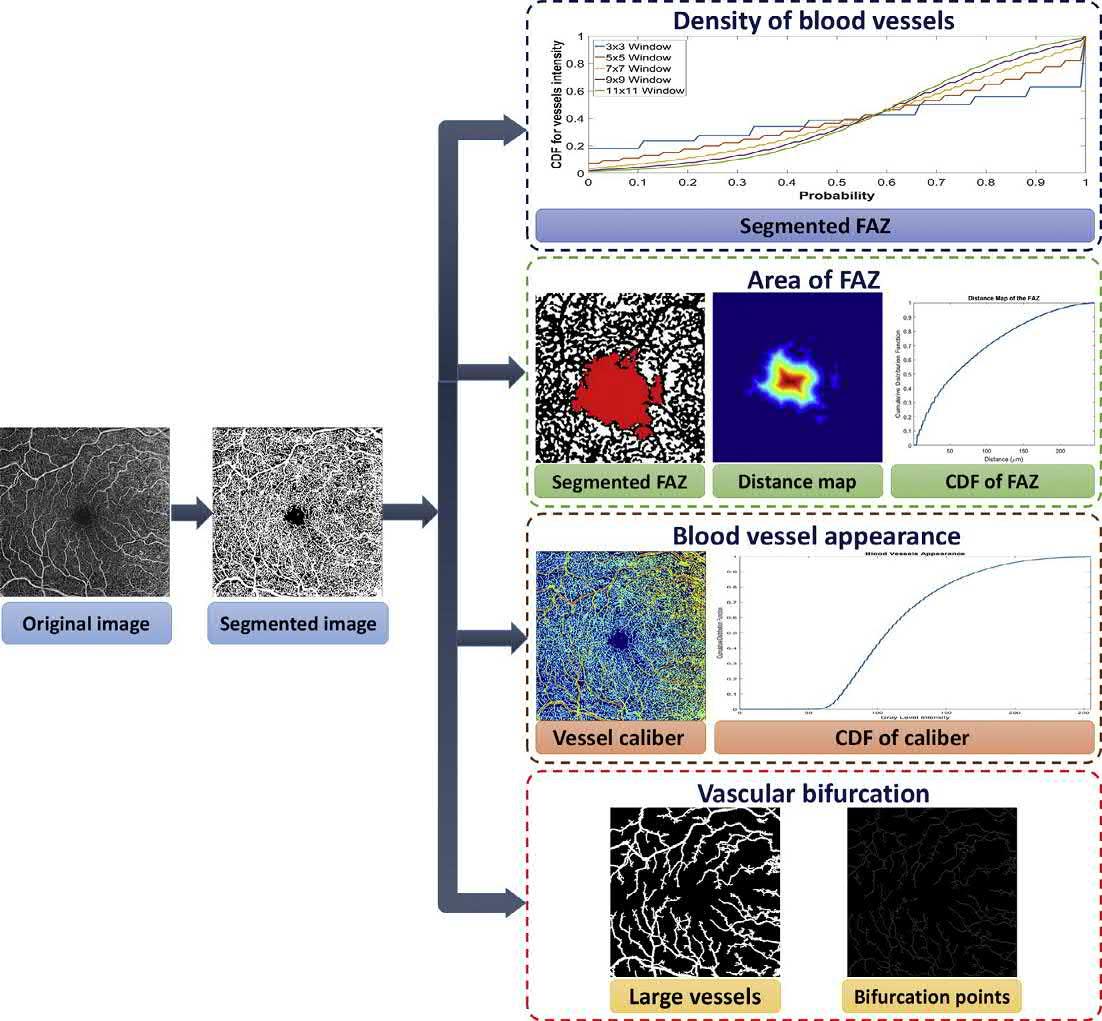 Retinovasculardiseasesconstituteamajorcauseofvisionloss.Diabetesoveralongperiod givesrisetodeteriorationofsmallretinalbloodvessels.Theseretinalbloodvesselsleak fluidsandblood,whichcauseretinaltissueswelling.Asaresult,itmaycausediabeticretinopathy(DR),whichisasignificantcomplicationofdiabetes[1].Theclinicalfeatures, suchasneovascularization,microaneurysms,andhemorrhages,areseeninpeoplesufferingfromDR.Neovascularizationistheappearanceofnewunusualbloodvesselsinmany partsoftheeyecontaining,ofcourse,theretina.Thewallsofthesenewvesselsareweak andmaybreakandbleed.Oneoftheprimaryeffectsofneovascularizationandbleedingis theappearanceofnewvascularcrossoverandbifurcationpointsintheretinalvasculature network[2].Therefore,earlyandaccuratedetectionofthesesignsisimportanttoprevent blindnessandavoidDRcomplications.Manualdiagnosisandanalysisoftheretinal imagesisatime-consumingandtediousprocess.Thus,automaticdetectionanddiagnosiswillminimizetimeandeffort,whichwillhelpintheearlydetectionofthedisease[3]. Therearevariousimagingmodalitiesforretinathatestimatethestateoftheblood vasculaturenetwork.Theseincludefluoresceinangiography(FA),colorfundus,andoptical