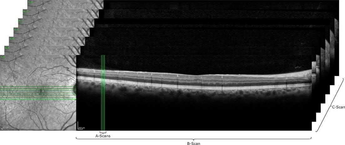 OCTisanoninvasive,micronlevel,high-resolutionimagingtechniquebasedonthe principleofMichelsoninterferometerthatprovidesreal-timeimagesoftheretina.Asis withMichelsoninterferometer,aninterferencepatternisproducedbysplittinglightinto twoarms:asamplearmfromscanningtheretinaandareferencearmfromamirror.These armsarethenrecombinedbysemitransparentmirrorsandredirectedtoaphotodetector orcamera [21].Iftheinterferenceisconstructivebetweenthetwoarms,thesignalis strongatthedetectorandiftheyaredestructive,thesignalisweakatthedetector. Areflectivityprofile,alsocalledanA-scan,canbegatheredbyscanningthemirrorin thereferencearmwhichcontainsinformationonspatialdimensionsandlocationof