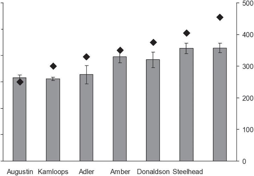 Fig. 5. Average contents of sum of eicosapentaenoic and docosahexaenoic fatty acids (EPA + DHA, bars and left axis, m ± SE) in rainbow trout of different strains from Farm 2 versus number of days from the start of year to the peak of spawning (a proxy of spawning season, diamonds and right axis).