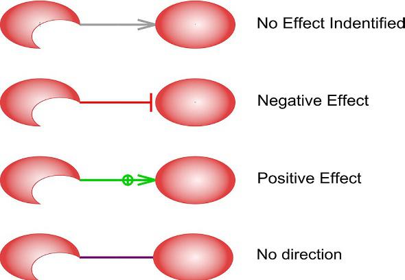 also have their specific shapes (Fig. 2). An arrow indicates the relationship between objects. Arrowheads graphically indicate the direction of the interaction and whether its effect is promotive (positive) or suppressive (negative) (Fig. 3). Types of interactions are marked by the color and style of arrows. For example, a gray dotted line without a head indicates an association