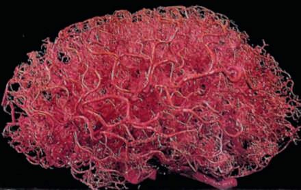 FIGURE 7 Vascular cast of a human brain shows the extensive branching of vessels into finer and finer structures. The cast was prepared by injection of a plastic emulsion into the brain vessels, and, upon hardening, the brain parenchymal tissue was enzymatically dissolved. Reproduced with permission from Ref. 5
