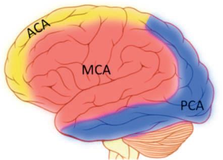 Perfusion fields of the major cerebral arteries. ACA, anterior cerebral artery; MCA, middle cerebral artery; PCA, posterior cerebral artery.